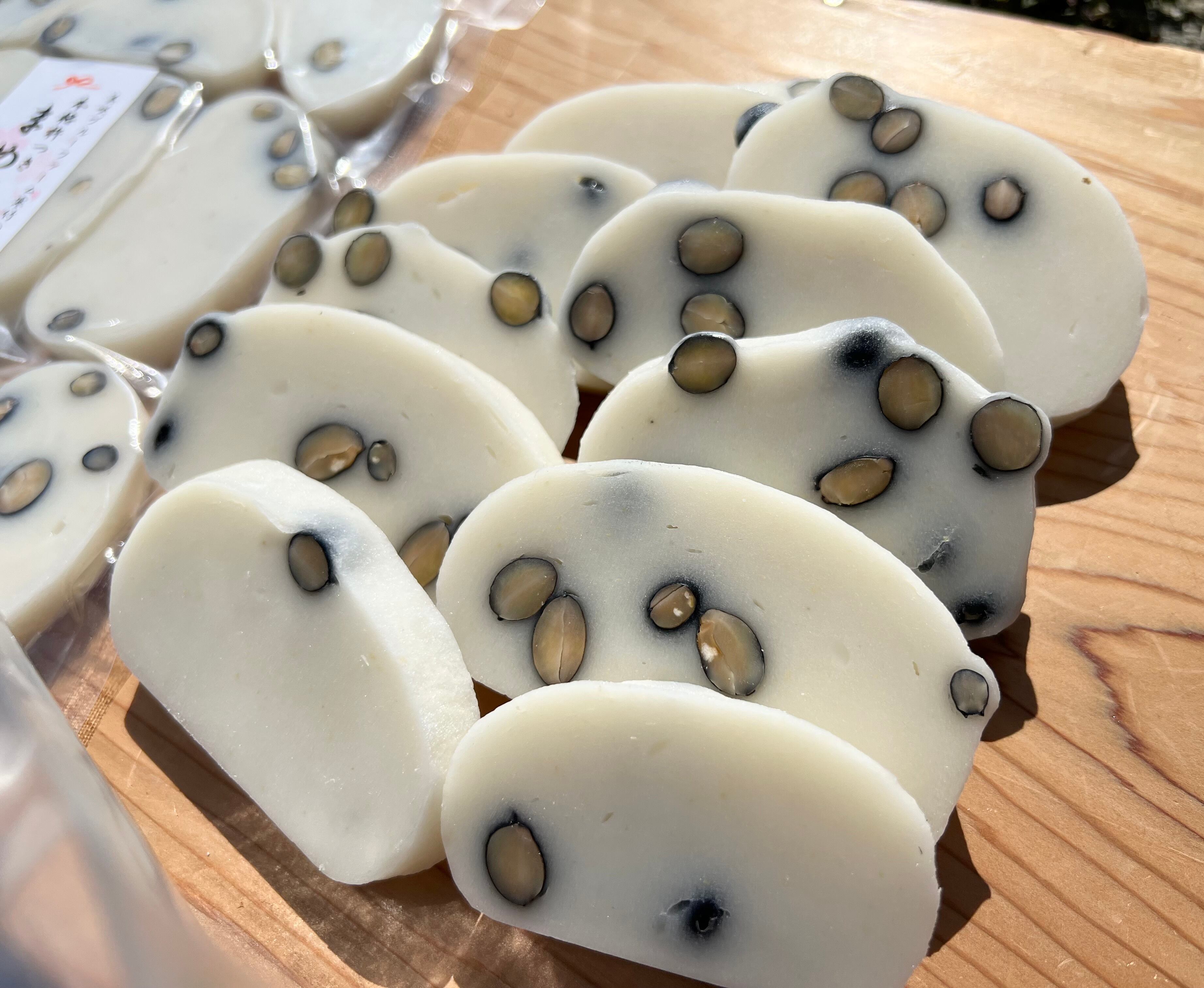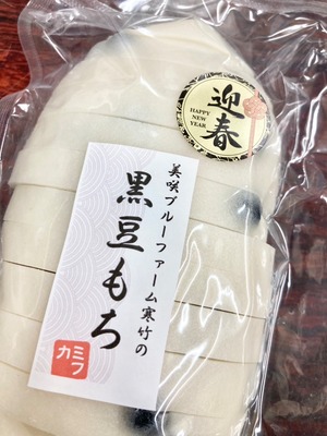 当園栽培の2種類の餅米をブレンドし、岡山県産の黒豆を使って、杵つきした塩味の豆餅です。